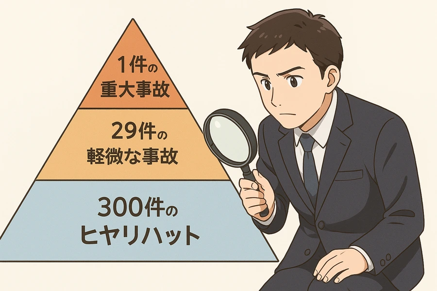 | ハインリッヒの法則 | はいんりっひのほうそく | 1件の重大事故の背景には、29件の軽微な事故と、300件のヒヤリハットがあるという法則。 | 「ハインリッヒの法則を意識し、ヒヤリハットの段階で対策を講じることが重要だ」 |
