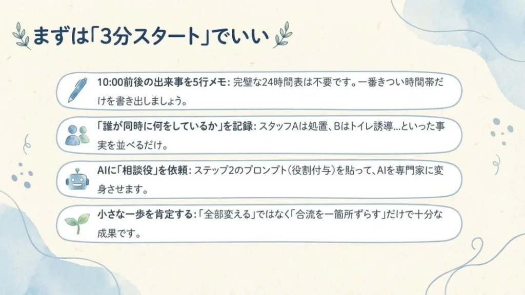 まずは 「10:00前後の渋滞だけ」、あるいは 「申し送りの時間だけ」 のように、気になるところを一か所だけ見える化できれば十分です。