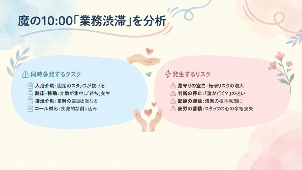 10:00の業務渋滞:入浴×離床×排泄が重なる時間帯