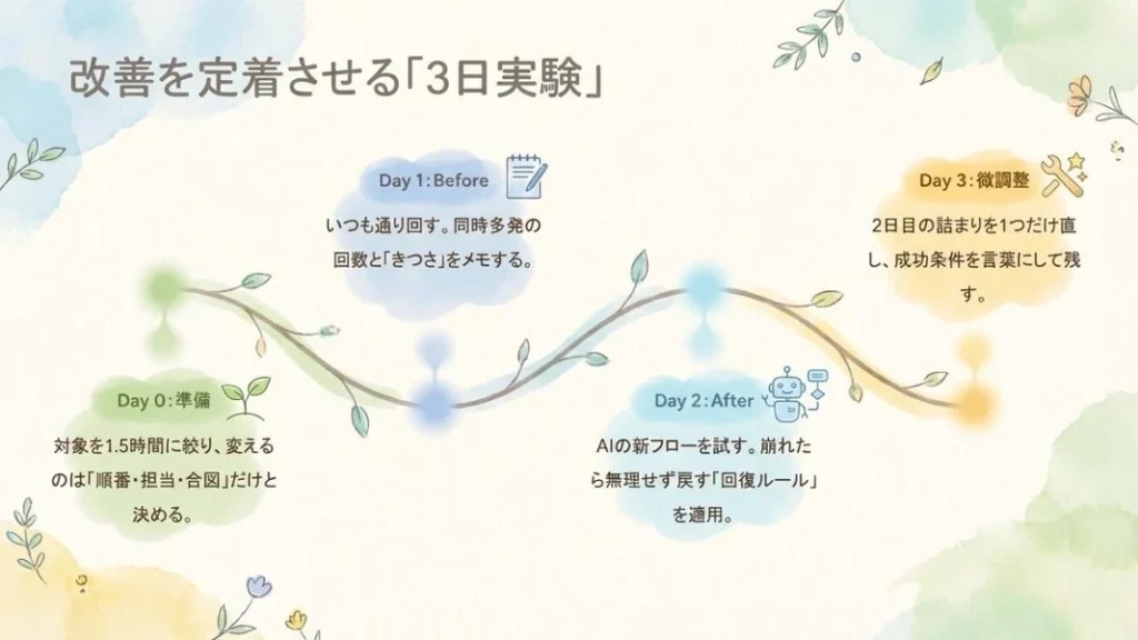 まずは 「10:00前後の渋滞だけ」 を 3日 試して、Before/Afterで変化を残してくださいね。
