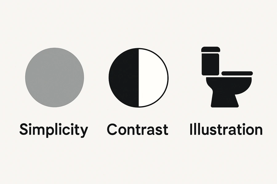 一般的なトイレのピクトグラム(人型のマーク)でさえ、それが何を示しているのか分からなくなることもあります。 そこで力を発揮するのが、「便器」や「蛇口」といった、具体的で、誰が見てもそれが何か分かるイラストです。