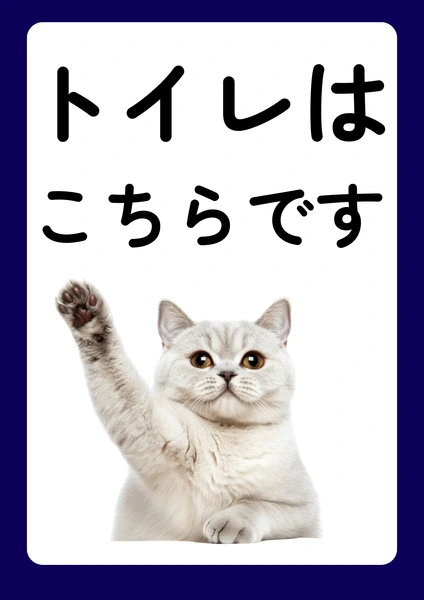 - 特徴: 可愛らしいネコのイラストが「こっちだよ」と案内してくれるような構図で、「トイレはこちらです⇩」の文字の横に配置されています。