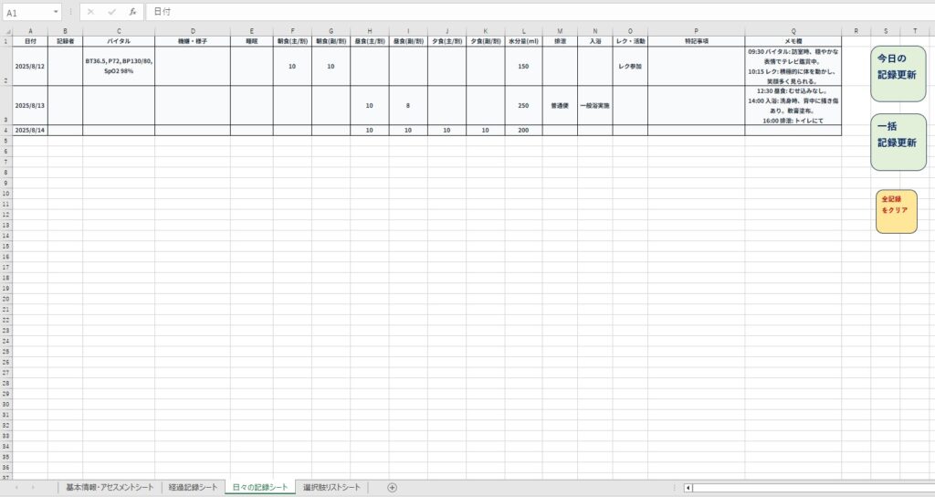 この記事で紹介する「介護記録の転記をゼロにするExcel情報共有ノート」は、そんな「書いても書いても終わらない記録」から「一度入力した記録を、ボタン一つで自動集計」へと変えていくための、無料Excelテンプレートです。