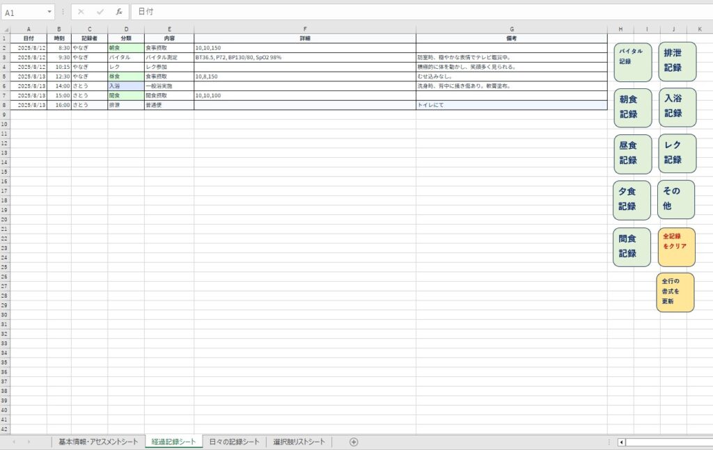 情報共有ノートの中心は「経過記録シート」です。ここに