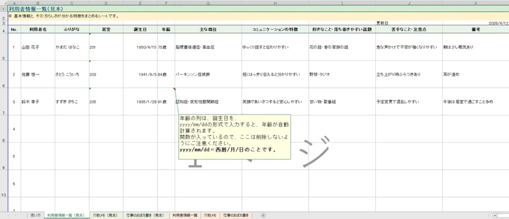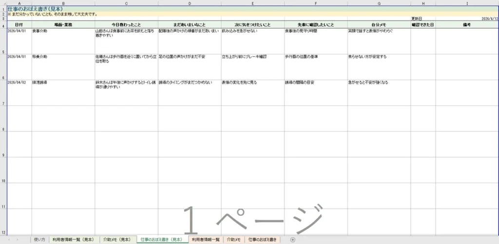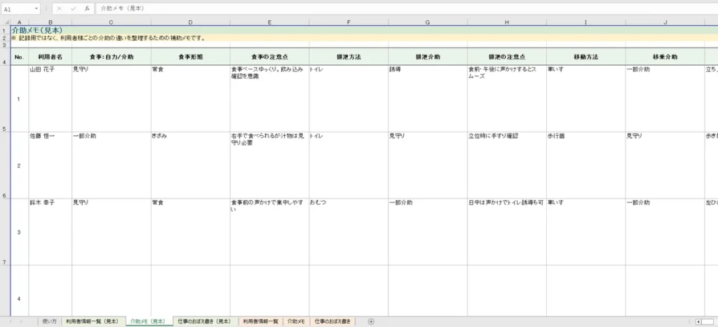 ※このテンプレートは、介護の仕事を覚えるための補助用です。