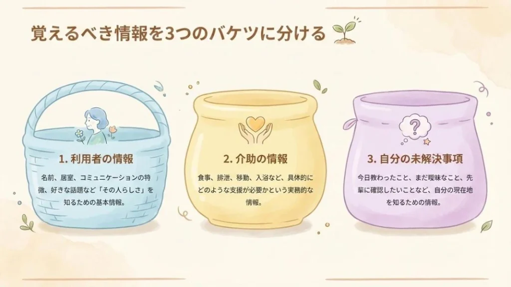 • 覚えることを「人の情報」「介助の情報」「自分の課題」に分ける
