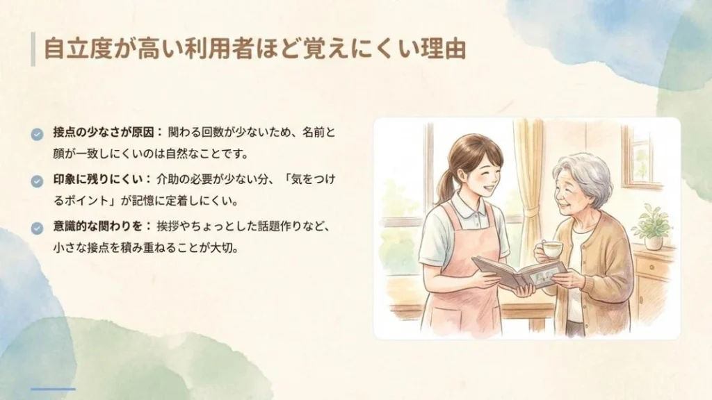 特に、自立度が高い方や関わる機会が少ない方は、印象に残りにくいことがあります。