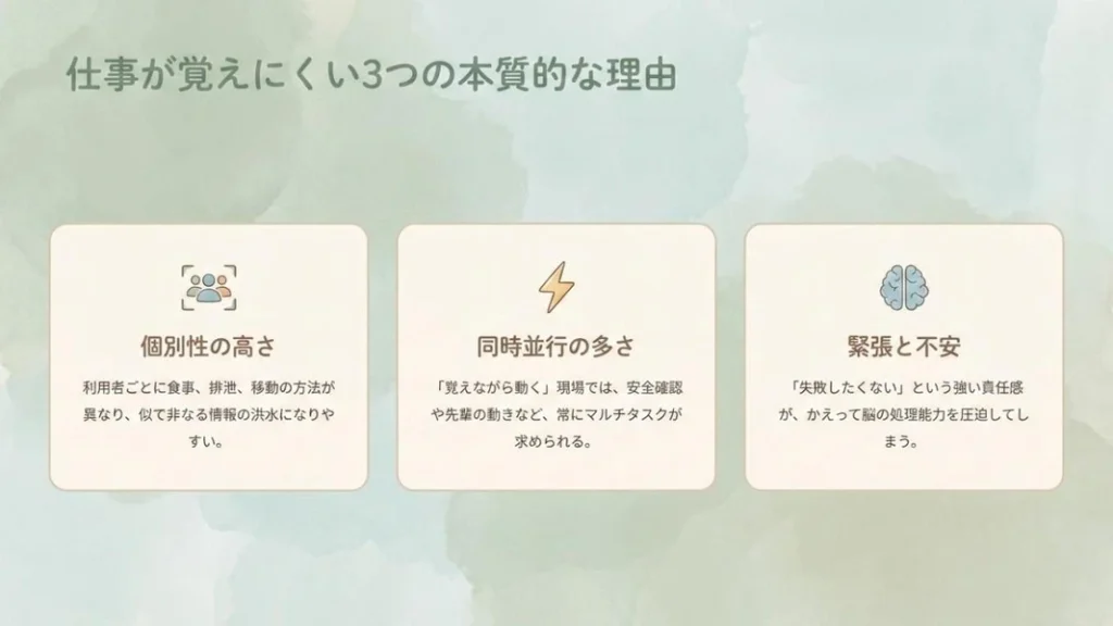 介護の仕事が覚えにくく感じやすいのは、単純に「覚える量が多いから」だけではありません。